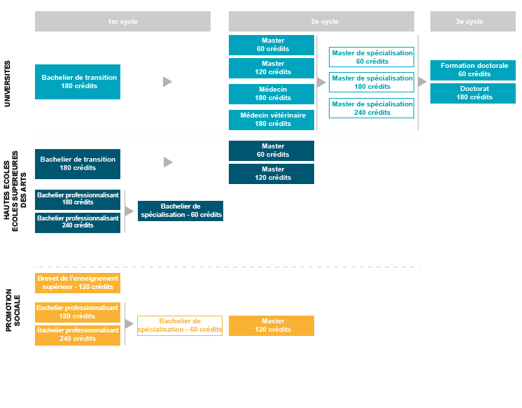 Les Universités organisent les études supérieures de type long, structurées en trois cycles, chacun sanctionné par l'octroi d'un grade, lequel est en principe nécessairement requis pour l'admission au cycle d'études suivant.